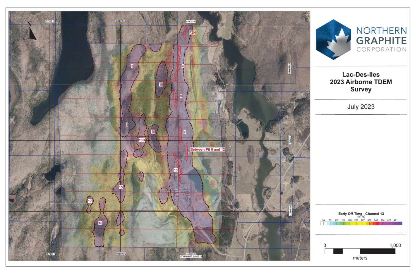 The interpretation of the survey data highlights the influence of north-south structural trends on graphite-bearing mineralization within the property. The areas with potentially high concentrations of graphite mineralization coincide with the geological contact between the metasedimentary rocks and quartzofeldspathic gneisses. This trend is consistent with the geology of current operations. These areas also exhibit high conductivity or EM responses (High Tau Values).