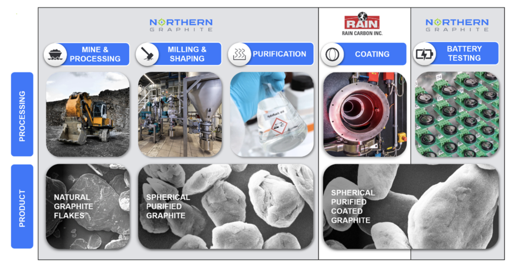 - In preparation to supply coming demand from North American battery markets, Northern signed a Joint Development Agreement (“JDA”) with Rain Carbon Inc. (“Rain”) to develop and commercialize advanced, natural graphite battery anode material (“BAM”) products used in lithium-ion batteries for electric vehicles (“EVs”);