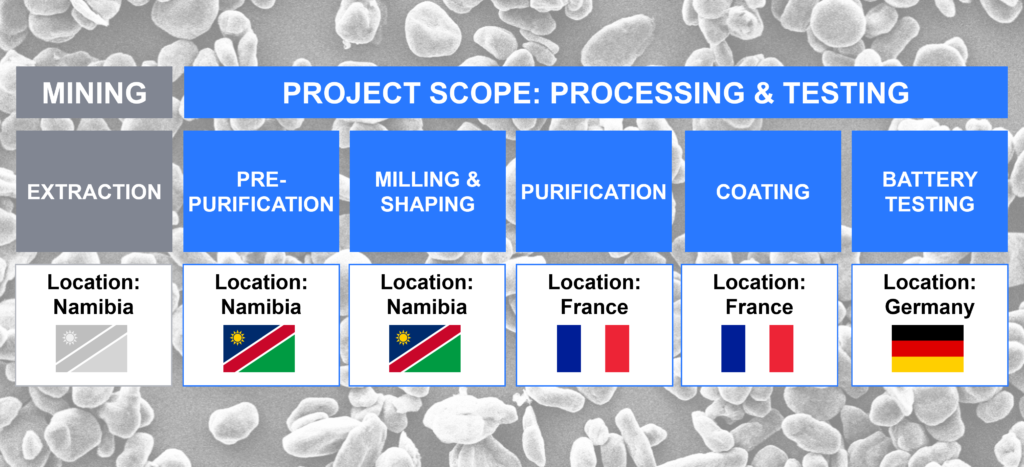 Northern’s Frankfurt-based Battery Materials Division (“NGCBM”) submitted the proposal last year to take battery grade graphite from its Okanjande project in Namibia and upgrade it into Battery Anode Material in a facility in France at a cost of some €159 million (CAD $244M). Under the scope of the project, pre-purification, milling and shaping of the graphite would occur in Namibia and purification and coating would take place at a new plant in France. Battery testing would take place at NGCBM’s laboratory in Germany. The mining of graphite at Okanjande is not covered under the scope of the Strategic Project.